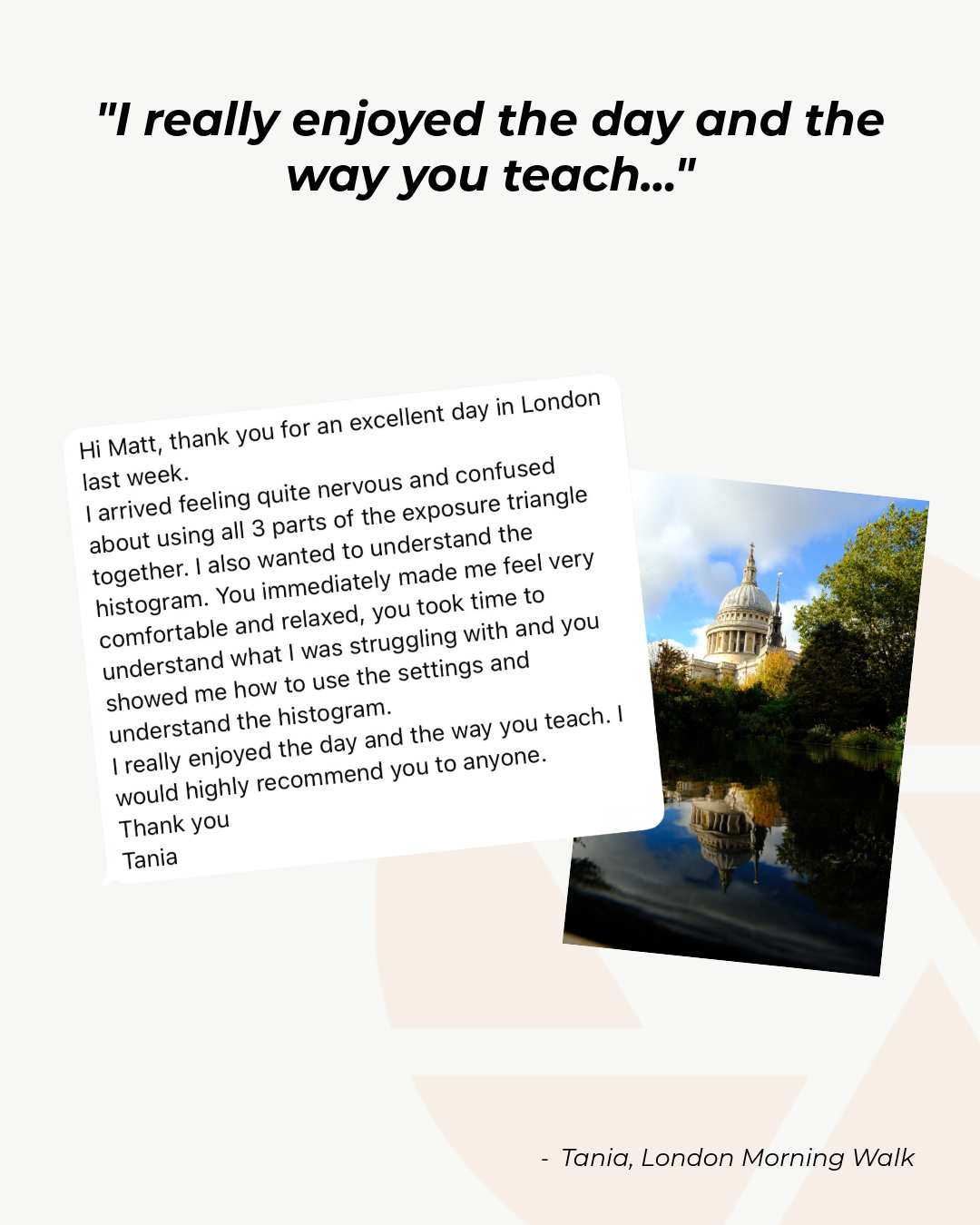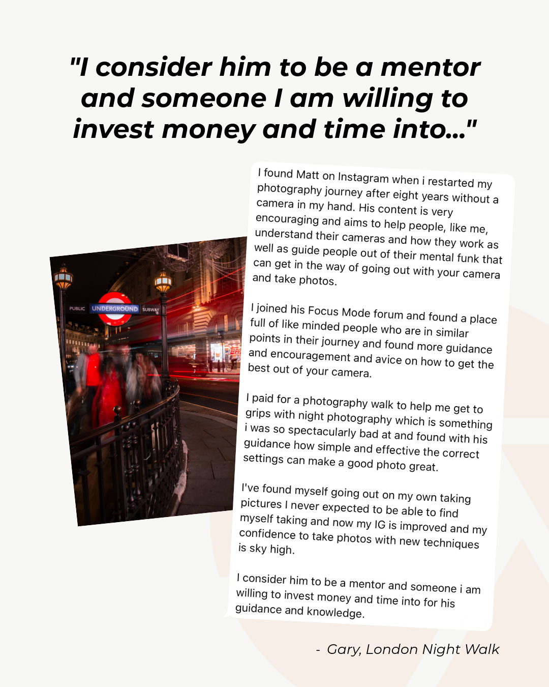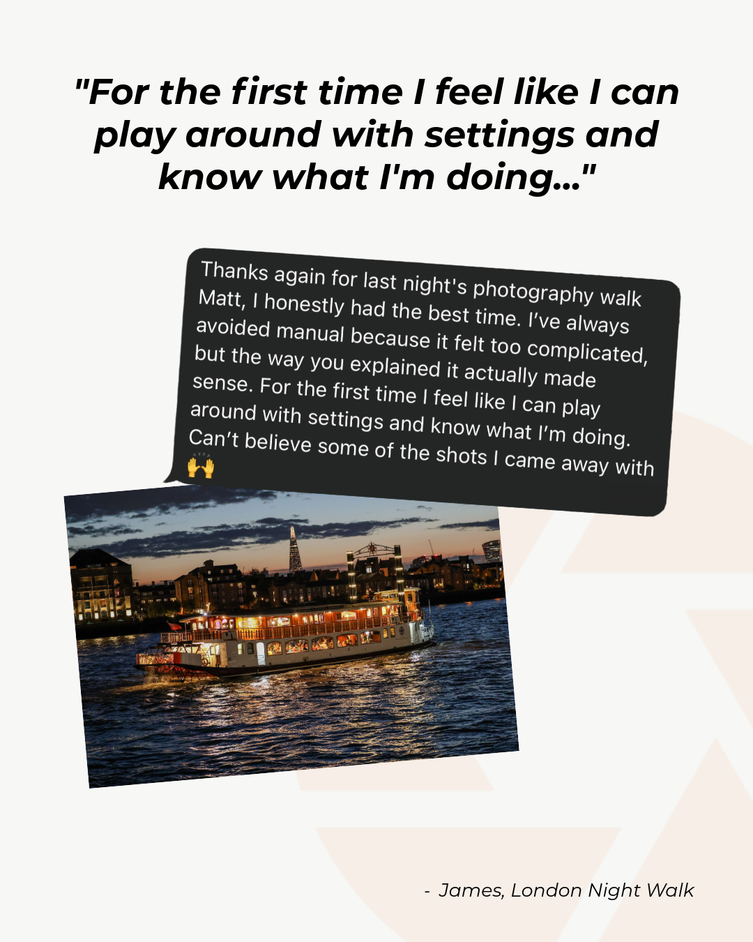 Before the walk, we’ll have a short one-to-one call to talk through your experience level, what you’re struggling with, and what you want to get out of the session. There’s no other preparation needed. Just bring your camera and be ready to shoot.